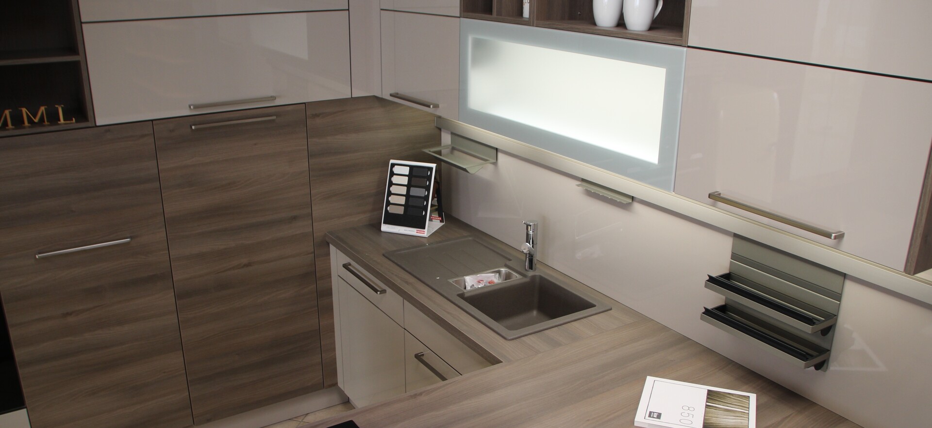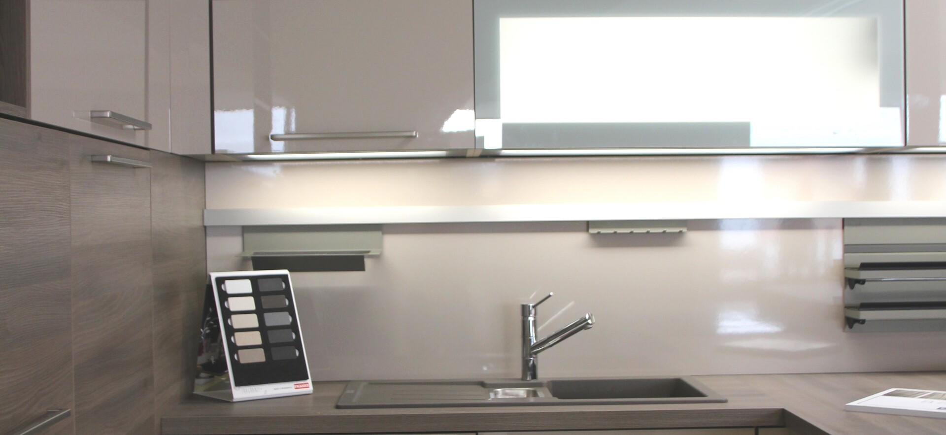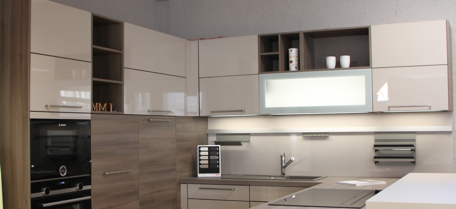 Durch die Farbkombination von Kaschmir-Hochglanz und Akazie-grau Fronten wirkt die Küche elegant und schlicht. Es gibt einige Besonderheiten wie die grifflosen Schränke in der Inselrückseite sowie 2 Oberschrank Lifttüren mit Mattglasfronten. Die Unterschränke sind ausgestattet mit Auszügen, (LeMans-)Auszug im Eckschrank, Abfallsystem im Spülenschrank und Antirutschmatten in den Schubkästen. Die matten Edelstahl Bügelgriffe fügen sich optisch in die Küche ein und haben eine angenehme Haptik.