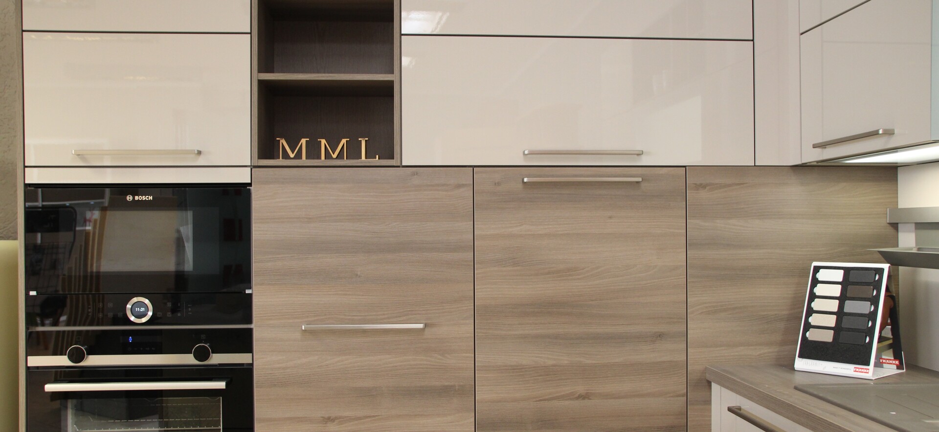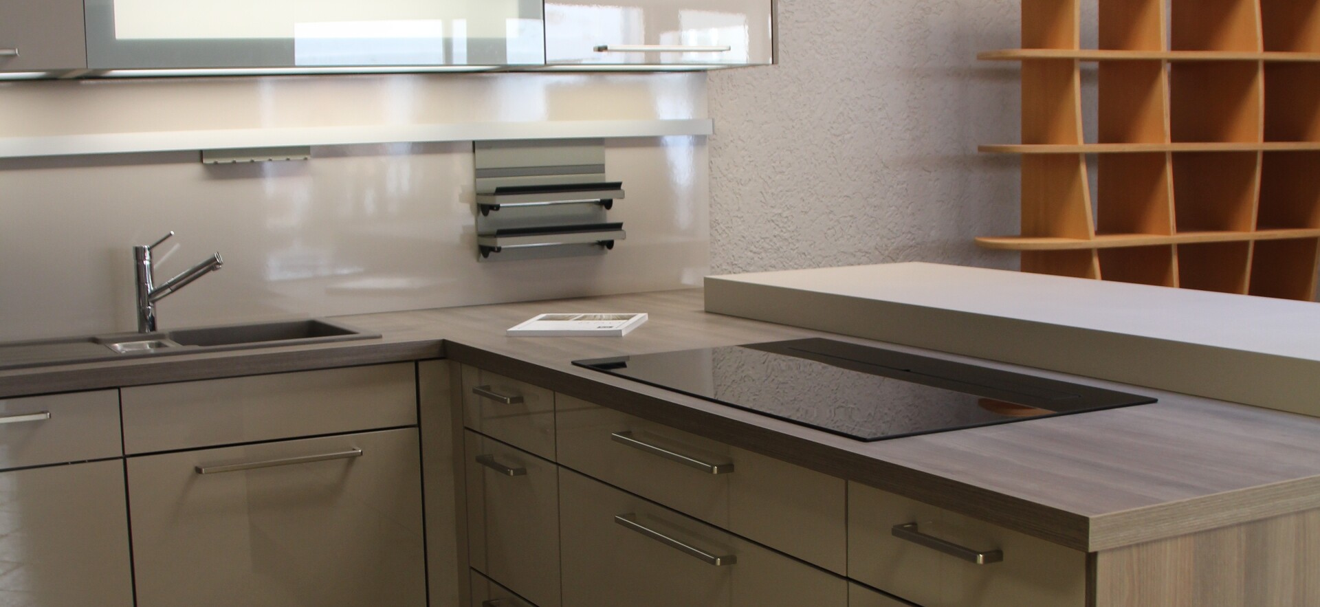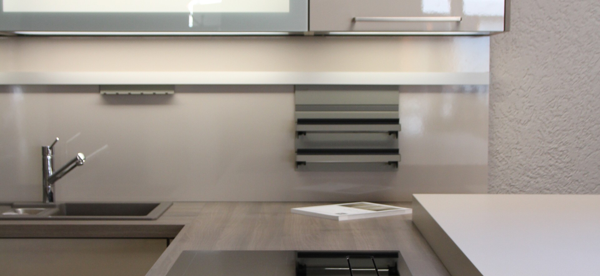 Durch die Farbkombination von Kaschmir-Hochglanz und Akazie-grau Fronten wirkt die Küche elegant und schlicht. Es gibt einige Besonderheiten wie die grifflosen Schränke in der Inselrückseite sowie 2 Oberschrank Lifttüren mit Mattglasfronten. Die Unterschränke sind ausgestattet mit Auszügen, (LeMans-)Auszug im Eckschrank, Abfallsystem im Spülenschrank und Antirutschmatten in den Schubkästen. Die matten Edelstahl Bügelgriffe fügen sich optisch in die Küche ein und haben eine angenehme Haptik.