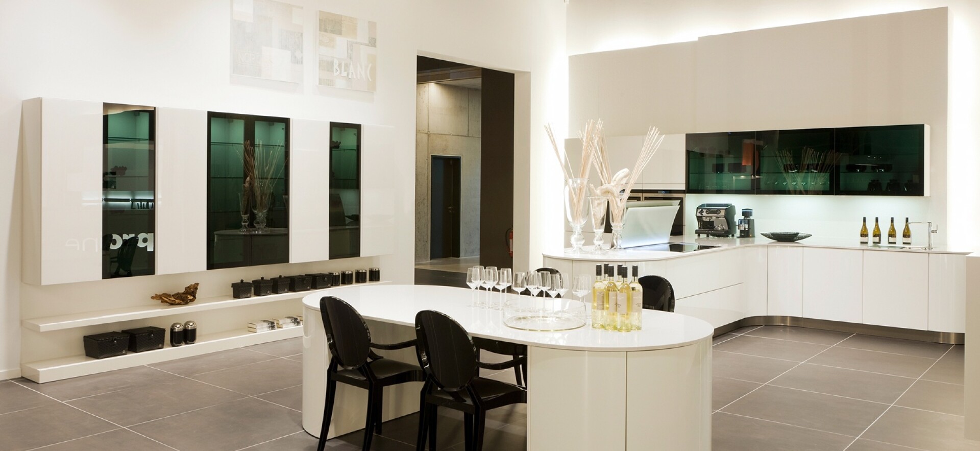 Schwarz hinterlackierte Scheiben setzen die Vitrinen- und Hängeschränke in eindrucksvollen Kontrast zum glänzenden Weiß. Ausgefallene Gläser und Sammlerstücke können dahinter reizvoll inszeniert werden. Die schwarzen Lackstühle und Accessoires sind passend ausgesuchte Konterfeis für dieses stilvolle Küchen-Ambiente.